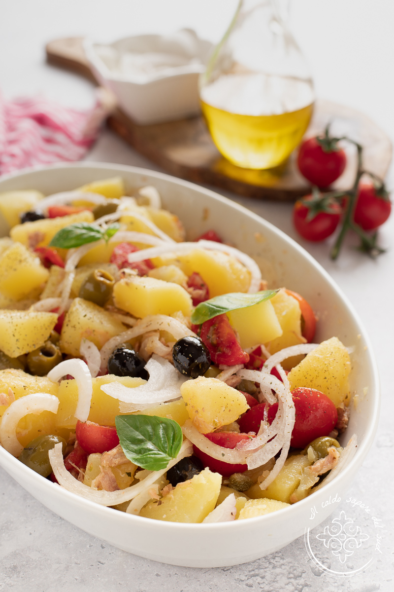 Insalata eoliana di patate, la ricetta della nonna di una delle insalate di patate più sfiziosa e più siciliana che ci sia. Fresca e golosa l’ insalata eoliana originale, detta anche insalata liparota è un’ insalatona di patate estiva da servire come contorno, come Secondo Piatto o come piatto unico. Si tratta di un’insalata di patate lesse che pare abbia origine nelle isole Eolie, in provincia di Messina. Composta da patate lesse, pomodorini rossi e dolci, olive, capperi, tonno, cipolla rossa, origano, olive e basilico, l’insalata delle isole Eolie è un tripudio di profumi e sapore.