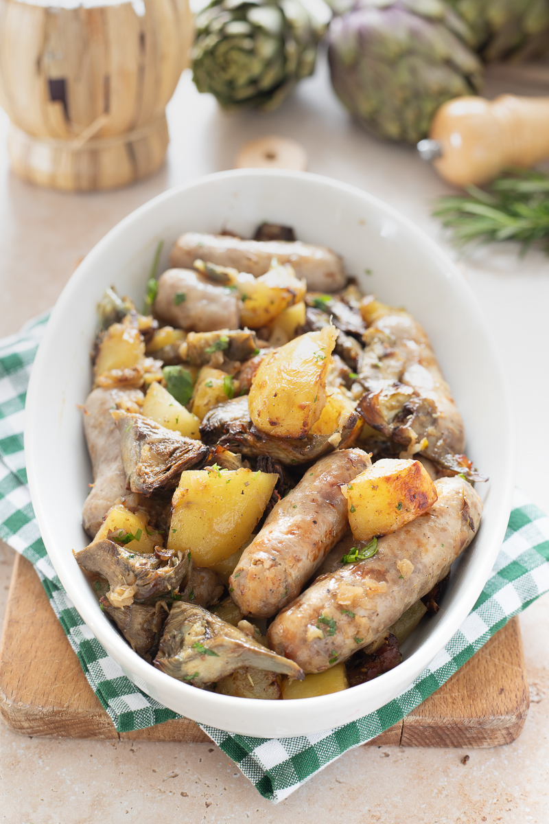 La salsiccia con carciofi e patate può essere cotta in forno o in friggitrice ad aria, i tempi e le temperature sono piuttosto simili, quindi regolatevi in base ai vostri gusti e alle vostre preferenze.